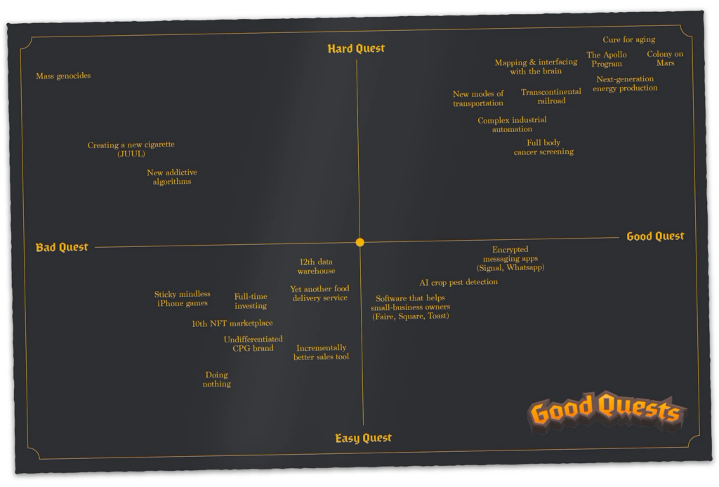 Finding a good quest gives you meaning and a sense of purpose. The purpose of a good quest is to do something that makes your little corner of the world a little better than you met it. Good quests that are easy are hard to find because most of the low-hanging fruit have already been plucked (There will never be a trillion-dollar social media network soon). So, good luck going into the world to do good quests that are hard and long-lasting.